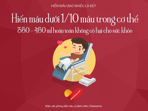Có rất nhiều bạn muốn tham gia sự kiện "Dân văn phòng hiến máu vì bệnh nhân Thalassemia" vào ngày 05.06.2016 sắp tới đã có băn khoăn về việc hiến máu nhiều có hại cho sức khỏe hay không? Hiến máu theo hướng dẫn của thầy thuốc không có hại cho sức khoẻ. Lượng máu trong cơ thể mỗi con người khoảng 70ml/kg cân nặng: như vậy, một người 50kg có khoảng 3500ml máu, người 65kg có khoảng 4500ml. Qua nghiên cứu và thực tế đã chứng minh, nếu bạn hiến dưới 1/10 lượng máu trong cơ thể (khoảng 250 – 450ml) theo đúng hướng dẫn của thầy thuốc thì hoàn toàn không có hại cho sức khỏe. Ngay sau khi hiến máu, các cơ quan sinh máu sẽ được kích thích và quá trình sinh tạo máu sẽ hoạt động với tốc độ gấp 8 - 10 lần so với bình thường. Hoạt động này của nhằm nhanh chóng lấy lại sự cân bằng của cơ thể sau khi hiến máu.
